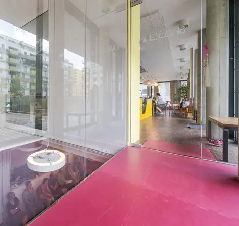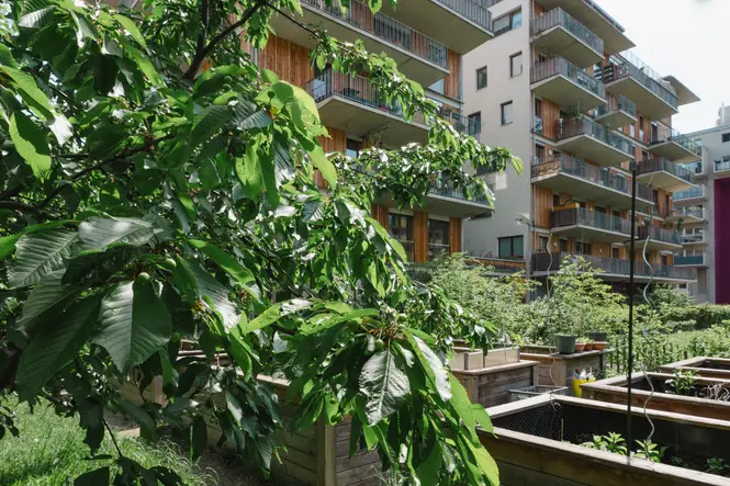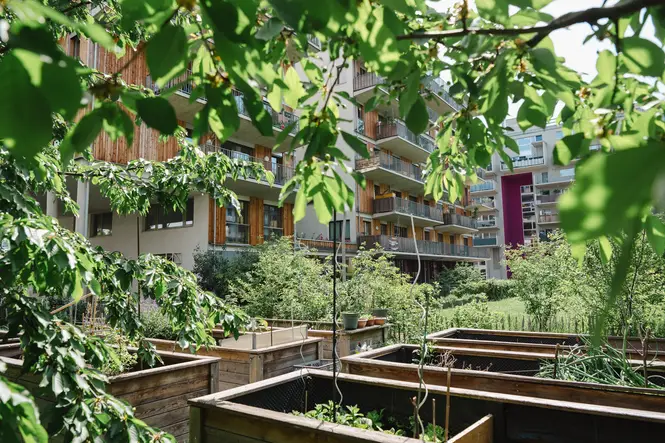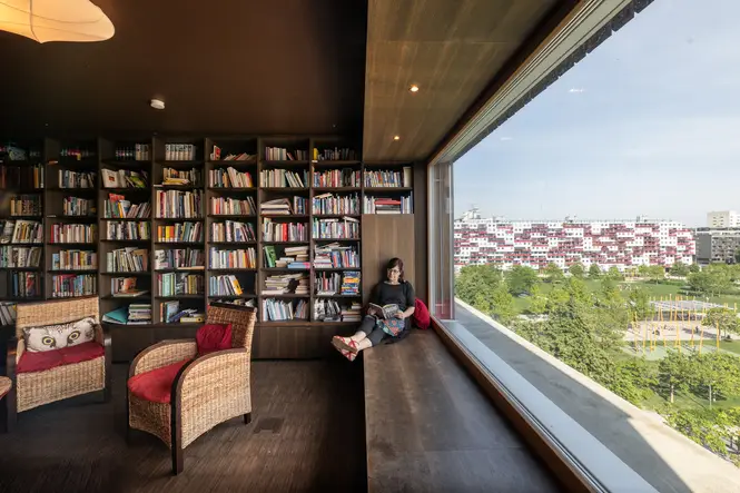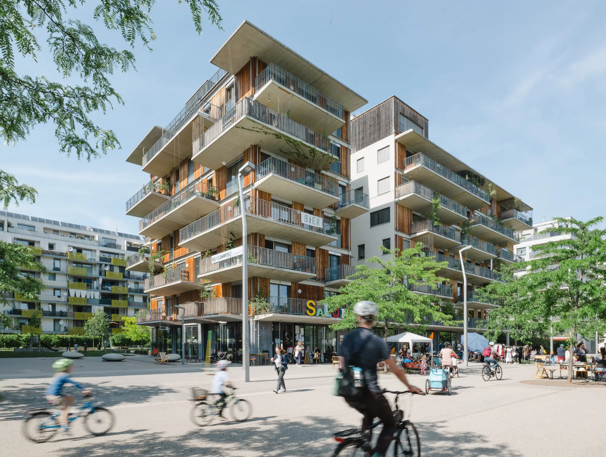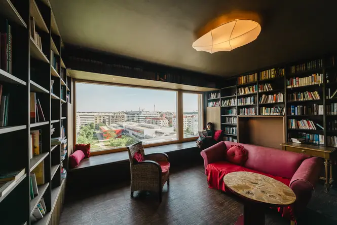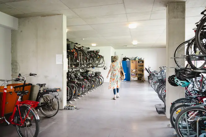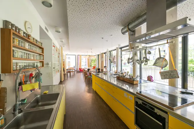 Damit der individuelle Verbrauch von Wohnfläche klein bleibt – was einen Einfluss auf die ökologische Nachhaltigkeit hat – gibt es im Haus viele Gemeinschaftsflächen, die geteilt werden: Kinderspielraum, Gemeinschaftsküche, Bibliothek, Meditationsraum, Dachgarten, Partyterrasse, Gästeapartments und ein großer Fahrradabstellraum. Es sind insgesamt 700 Quadratmeter Gemeinschaftsflächen.